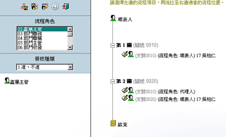 設定流程角色選項中所設定的員工是那一位,這個選項會與流程角色選項互相呼應,若您在流程角色中選擇的是員工,那麼這個地方顯示的選項就是員工姓名,如果您在流程角色中選擇的是部門主管,那麼這個地方就會顯示部門代號選項,意即,這個地方是隨著流程角色而變動,選擇不同的流程角色就會出現相對應的選項供您選填 |