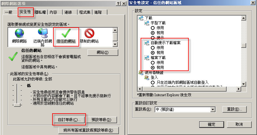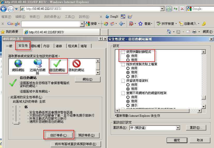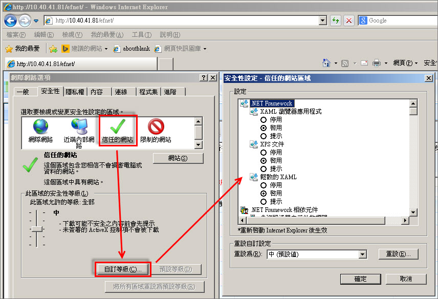 1.請將EF.NET 主機網址的位址 加入信任網站