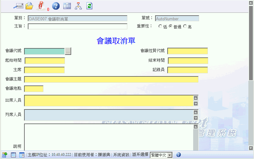 會議通知單已發送過通知給所有與會人員後,若是是欲取消該會議,則使用者可以填寫此表單,發送會議取消通知給所有的與會人會。