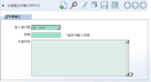 本作業用來建立及維護常用的片語。片語代號可以先依照部門區分或使用種類來進行大分類,之後再加上小分類或代號。在電子表單簽核時,可以直接套用已經建立的片語,節省打字的時間。