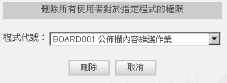 2. 刪除所有使用者對於指定程式的權限,畫面如下,請由下拉選單中選定要刪除使用權限的程式代號,點選「刪除」,即刪除所有使用者對於該程式之使用權限。