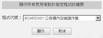 3. 顯示所有使用者對於指定程式的權限,畫面如下,請由下拉選單中選定要顯示使用權限的程式代號,點選「顯示」,即顯示所有使用者對於該程式之使用權限。