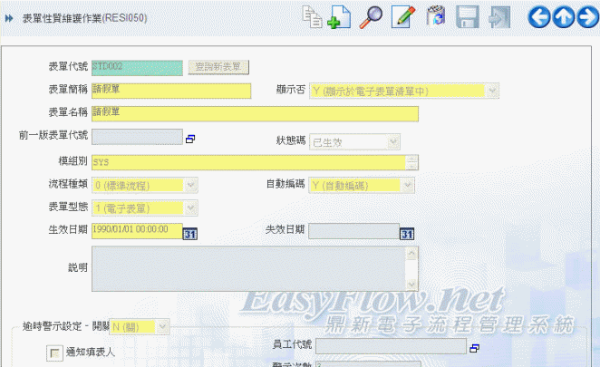 使用表單精靈功能中製作的電子表單,為了具備流程能力,結合EasyFlow來運作,必須在本維護作業中定義此表單的性質(如以下"欄位說明"),此張表單必須有完整的性質資料,才能結合EasyFlow正常運作。
